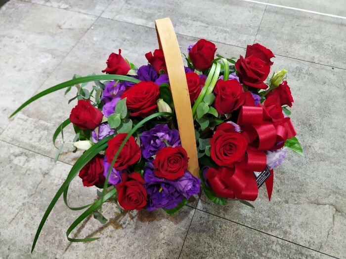 16朵紅玫瑰+紫桔梗+小提籃搭配