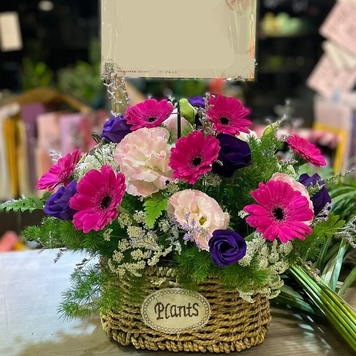 7朵太陽花+粉桔梗+藤編花籃搭配