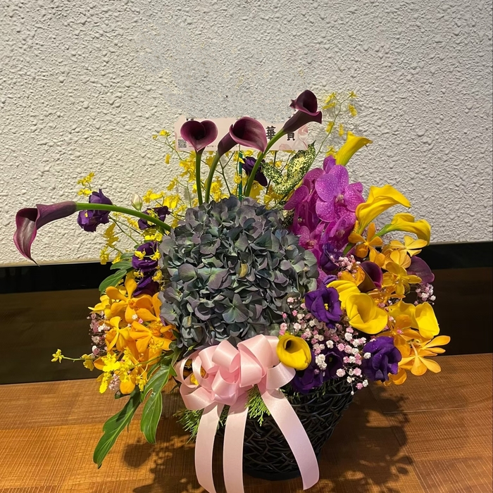 花禮說明:海芋+萬代蘭+繡球花1朵+適量紫桔梗