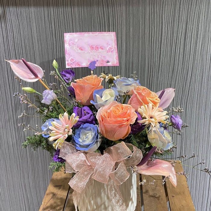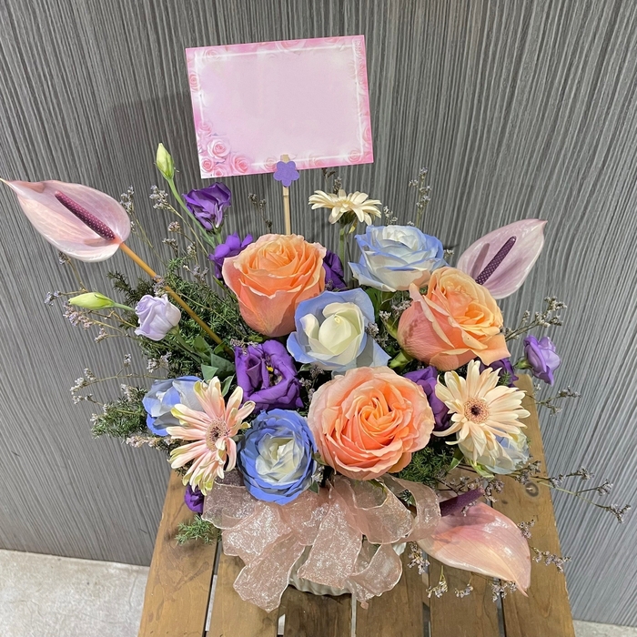 花禮說明:特選玫瑰+火鶴+適量桔梗+當季葉材