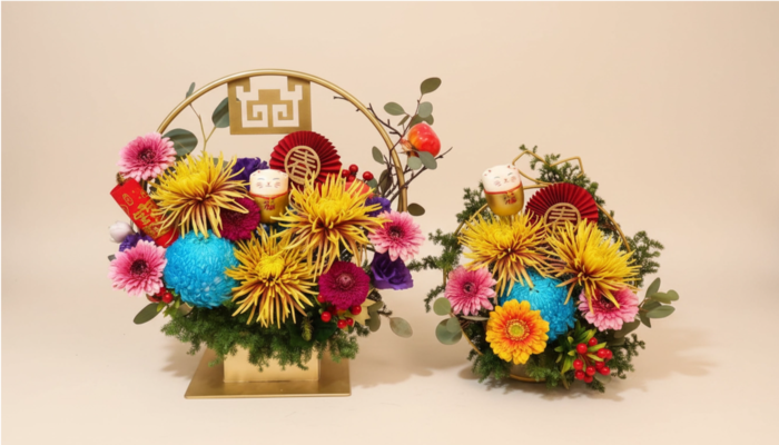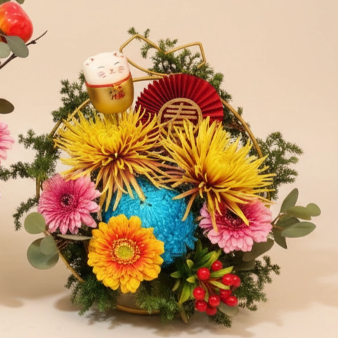 煙火菊2朵+牡丹菊+小菊+當季葉材+金色花器